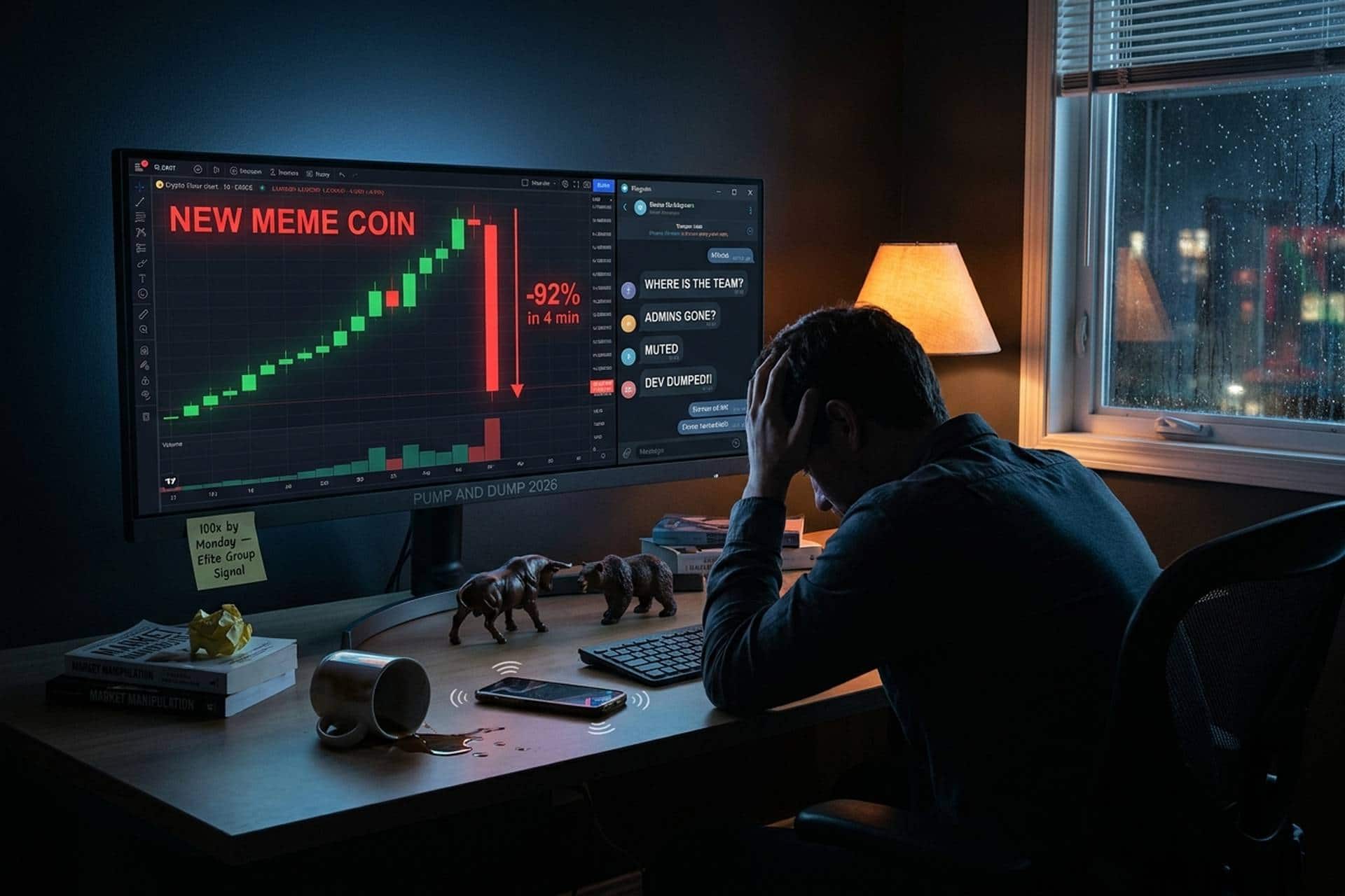 तीसरा चरण: डंप। एक बार कीमत और वॉल्यूम लक्ष्य तक पहुँच जाने पर, आयोजक सब कुछ बेच देते हैं। उनके वॉलेट से सारा पैसा खुदरा खरीदारों के पास चला जाता है। चार्ट में भारी गिरावट आती है, आमतौर पर कुछ ही घंटों या मिनटों में 80-99% तक। प्रचार बंद हो जाता है। टेलीग्राम ग्रुप शांत हो जाता है या डिलीट कर दिया जाता है। चेनैलिसिस के DEX पंप-डंप पूल के आंकड़ों के अनुसार, टोकन 6-7 दिनों के भीतर बेकार हो जाता है। आयोजक अपना मुनाफा कमा लेते हैं; खुदरा शेयरधारकों के पास एक बेकार टोकन रह जाता है।