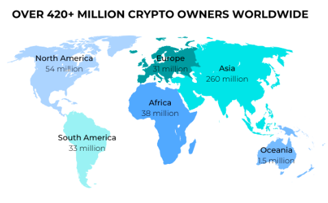 Cryptocurrency adoption has been on the rise globally, with over 420 million crypto users worldwide and an average global crypto ownership rate of 4.2% indicated in 2023. Crypto adoption goes at a rapid pace, and there are more and more people around the world who use cryptocurrency as payment for goods and services.